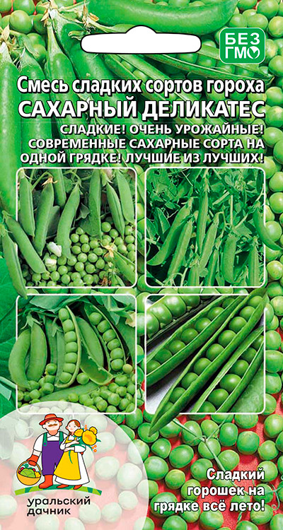 Наша смесь — настоящая находка для гурманов и лакомство для детворы! Все сорта отличаются не только скороспелостью, деликатесным вкусом, но и самым длительным периодом плодоношения. Створки бобов сочные, нежные, сладкие, не имеют волокон, обладают высокими вкусовыми и питательными качествами. Горошек выращивается без опор и не полегает. Рекомендуется для употребления в свежем виде, для консервирования и замораживания. Все сорта входящие в смесь включены в Государственный реестр селекционных достижений!