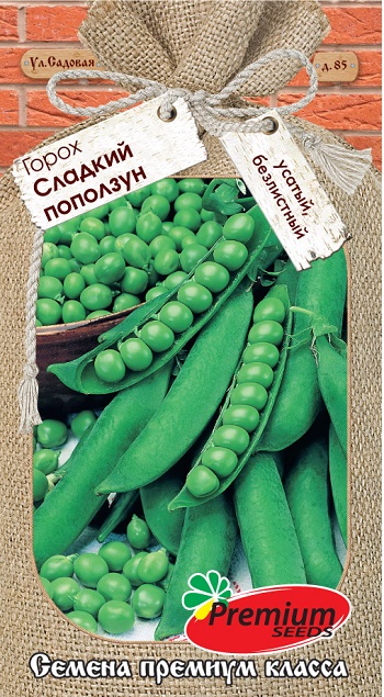 ГОРОХ Сладкий поползун - раннеспелый (период от всходов до начала технической спелости 53-55 дней) сорт усатой формы овощного гороха. Отличается скороспелостью и самым длительным периодом плодоношения среди всех ранних сортов овощного гороха. Высота растения - 70-85 см. Бобы слабоизогнутые, средней длины, зеленые. В бобе содержится 8-9 крупных, сладких горошин отличного вкуса и качества. Прекрасный продукт для использования в свежем виде, в домашней кулинарии, консервирования и замораживания.