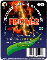Гроза - готовые к применению гранулы для борьбы с улитками и слизнями. Кроме активного вещества против слизней (метальдегида) препарат содержит добавки привлекающие вредителей и отпугивающие птиц. Слизни и улитки с большой охотой идут на гранулы Грозы, а после контакта с ними теряют слизь и гибнут. Обычно 1-2 обработок на сезон достаточно, что бы защитить растения от слизней.